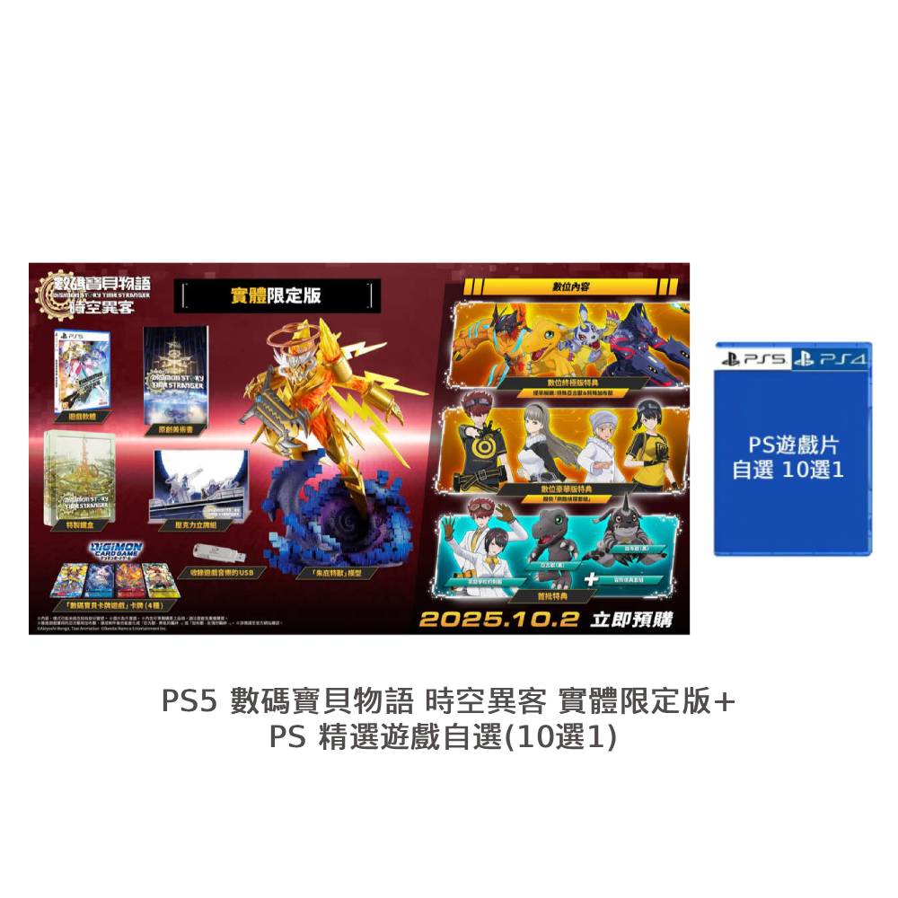 - 此商品屬 「 經消費者拆封之影音商品或電腦軟體」,不適用鑑賞期法規。注意:遊戲封面及內容物為參考示意圖,請以實際出貨為準!PS5 數碼寶貝物語 時空異客 限定版 台灣公司貨 X PS 精選遊戲片*1【實體限定版內容】.《數碼寶貝物語 時空異客》實體遊戲片.「朱庇特獸」模型.原創美術書.特製鐵盒.收錄遊戲音樂的USB.壓克力立牌組.「數碼寶貝卡牌遊戲」卡牌(4種).數位豪華版特典:服裝「網路偵探套組」(服裝1種,4位角色).數位終極版特典:提早解鎖可以進化成「亞古獸 -勇氣的羈絆-」的特殊亞古獸&可以進化成「加布獸 -友情的羈絆-」的特殊加布獸