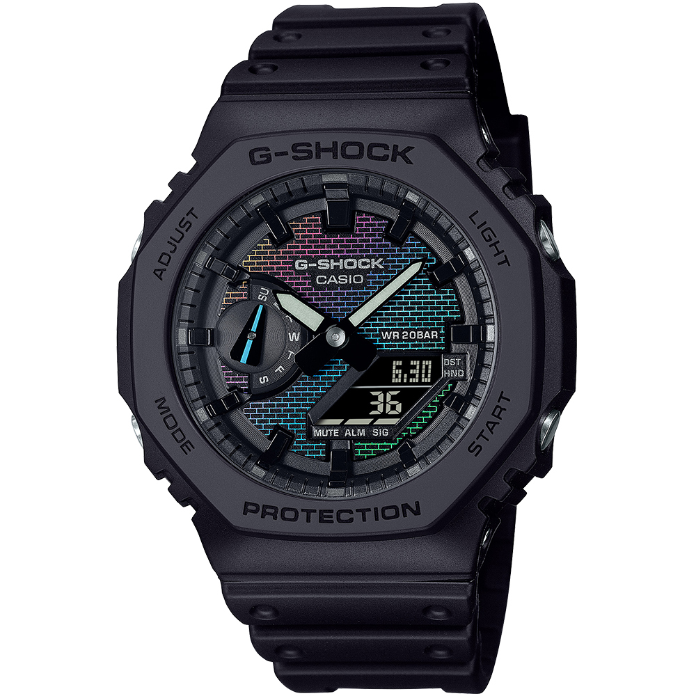 針對2100型號,錶盤採用銀色蒸鍍、雷射雕刻和彩虹印刷來呈現彩虹磚牆圖案。
