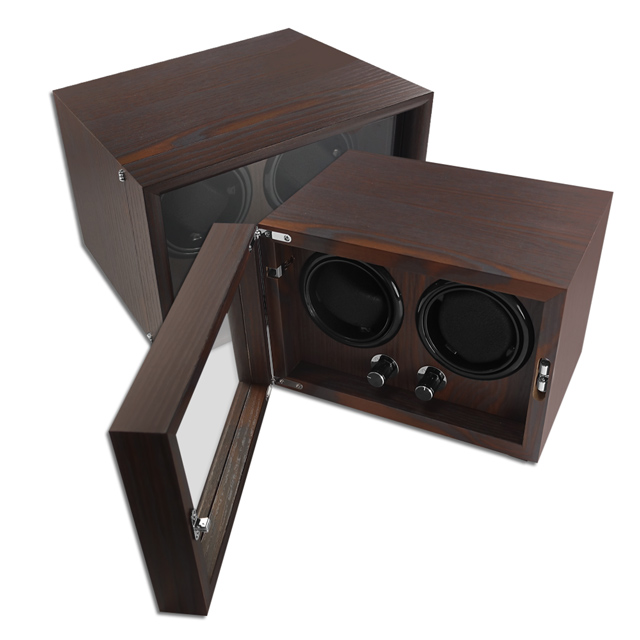 機械錶自動上鍊盒 2旋2入錶座轉動 LED燈 黑檀木皮 - 深褐x黑 #SKW142P02-BB