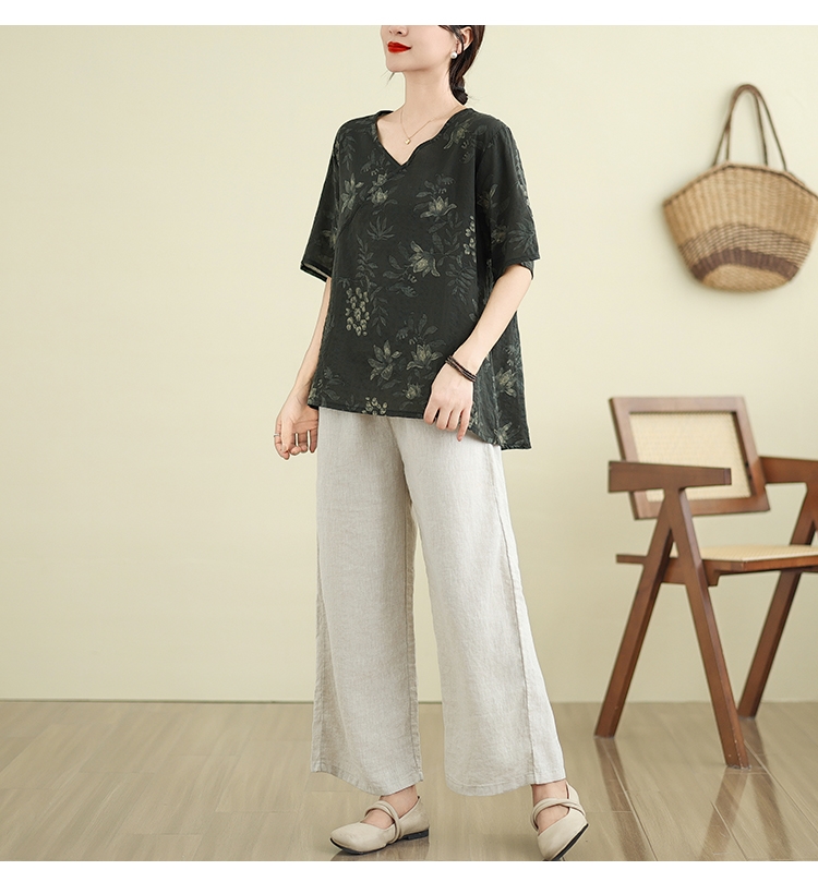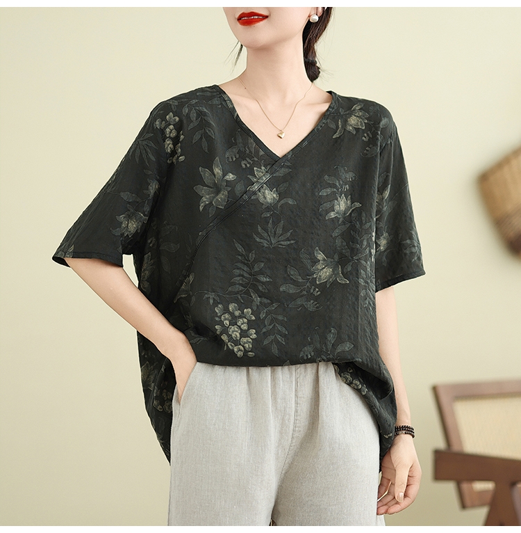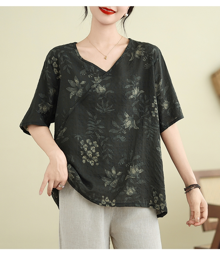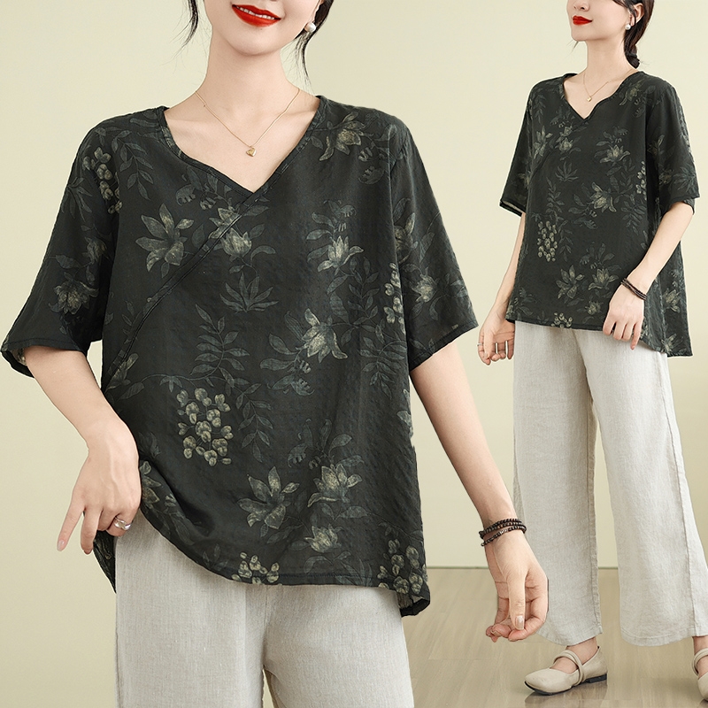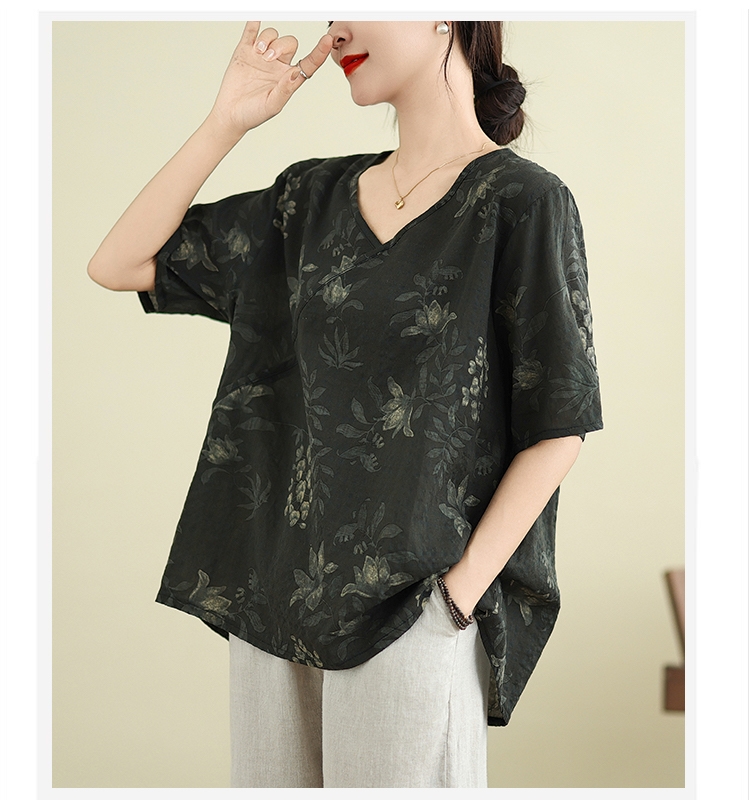 AKARA 輕優雅飄逸雨夜花綿麻五分袖上衣 (春秋 3XL有做 修身剪裁 中大尺碼)