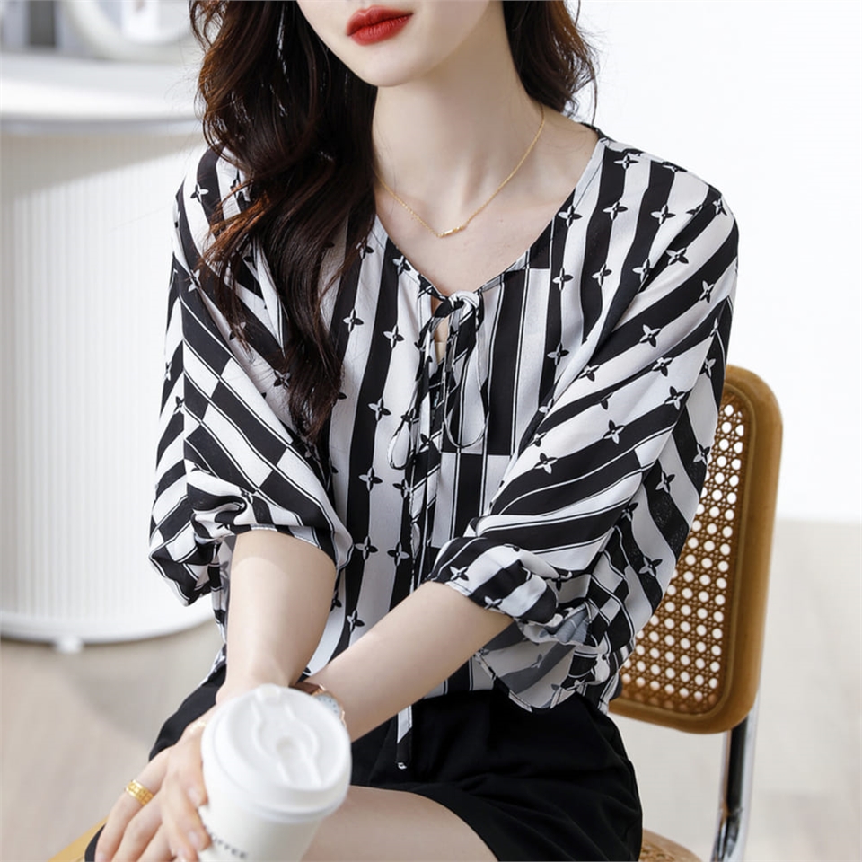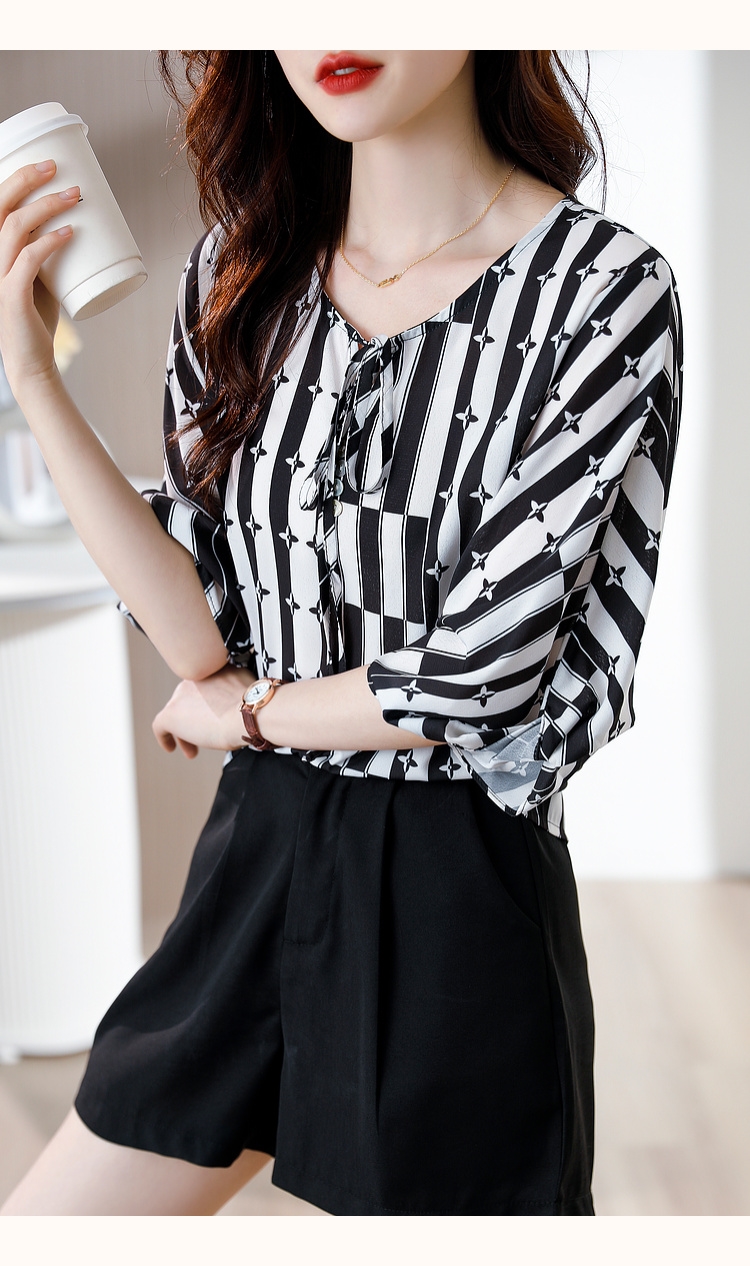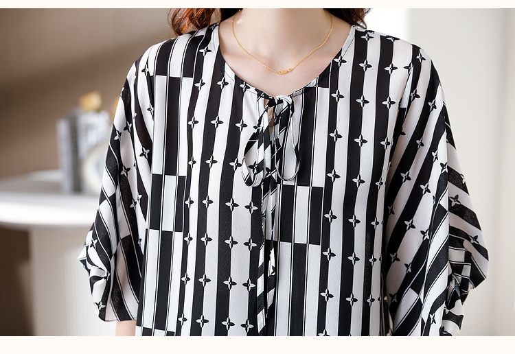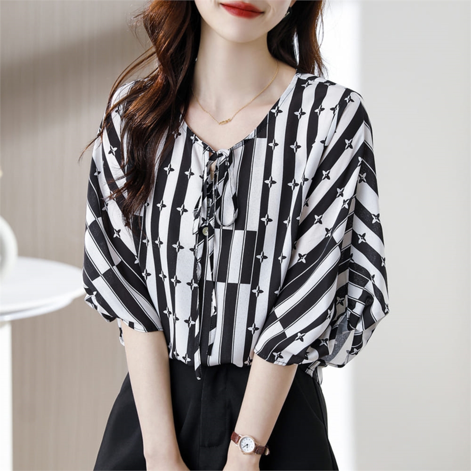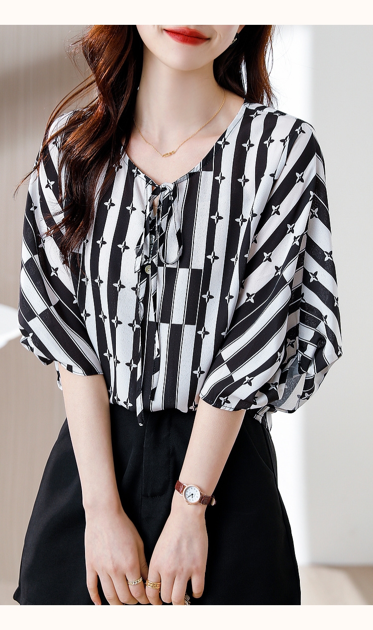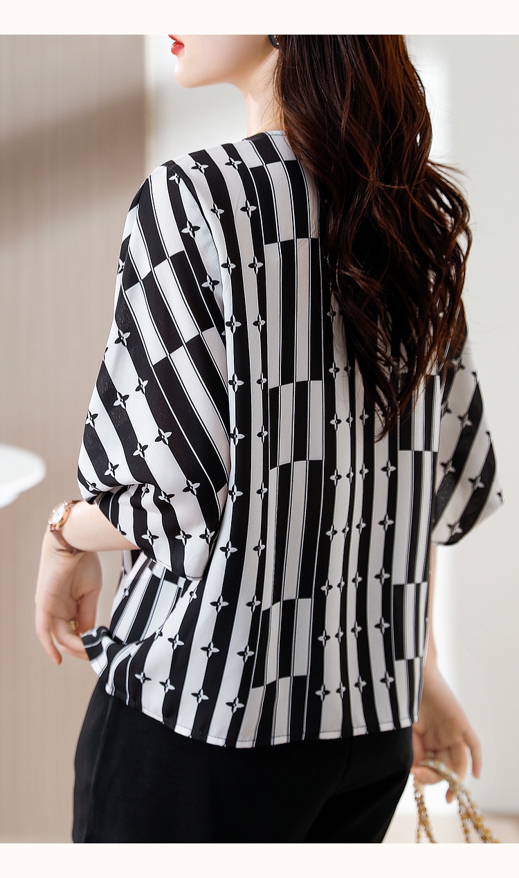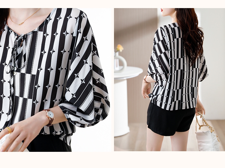 AKARA 歐風黑白剪影五分袖雪紡上衣 (春秋 2XL有做 顯瘦剪裁 中大尺碼)