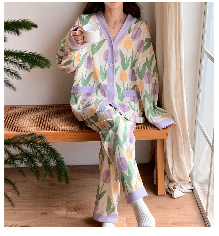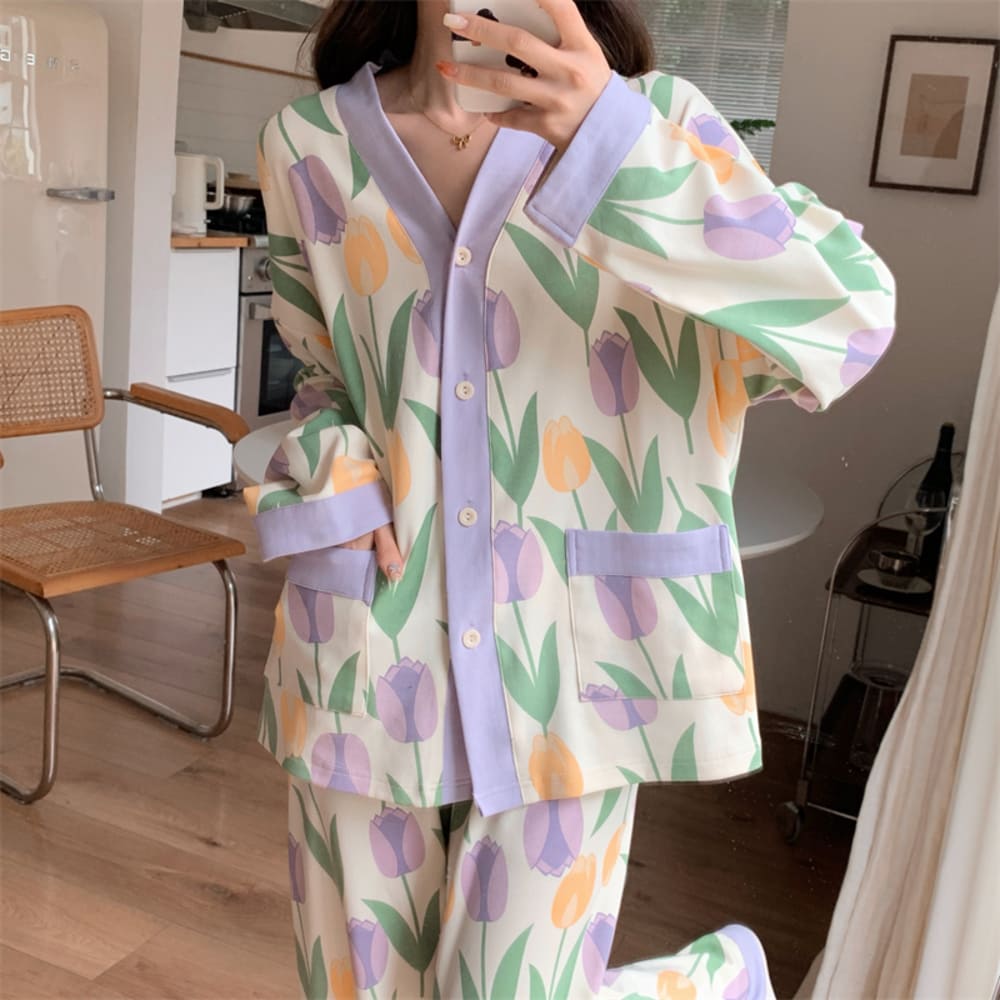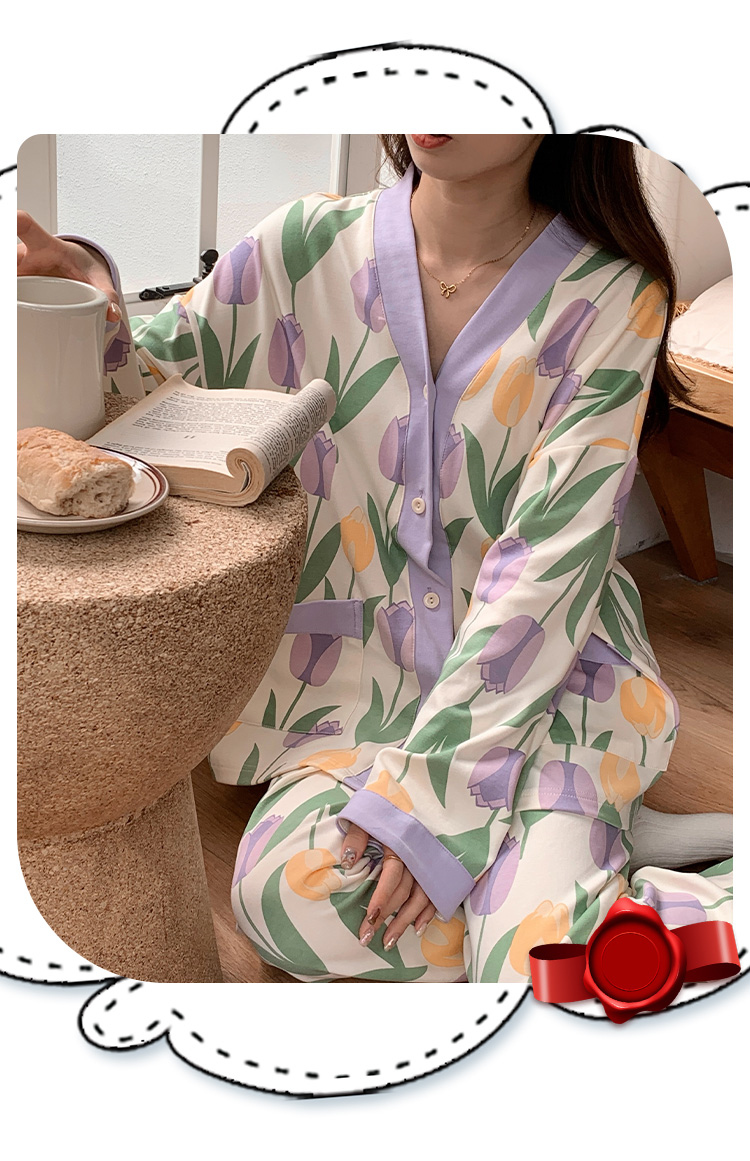 AKARA 好眠睡衣寬鬆穿鬱金香長袖長褲連扣襯衫(秋冬 3XL有 寬版剪裁 中大尺碼)