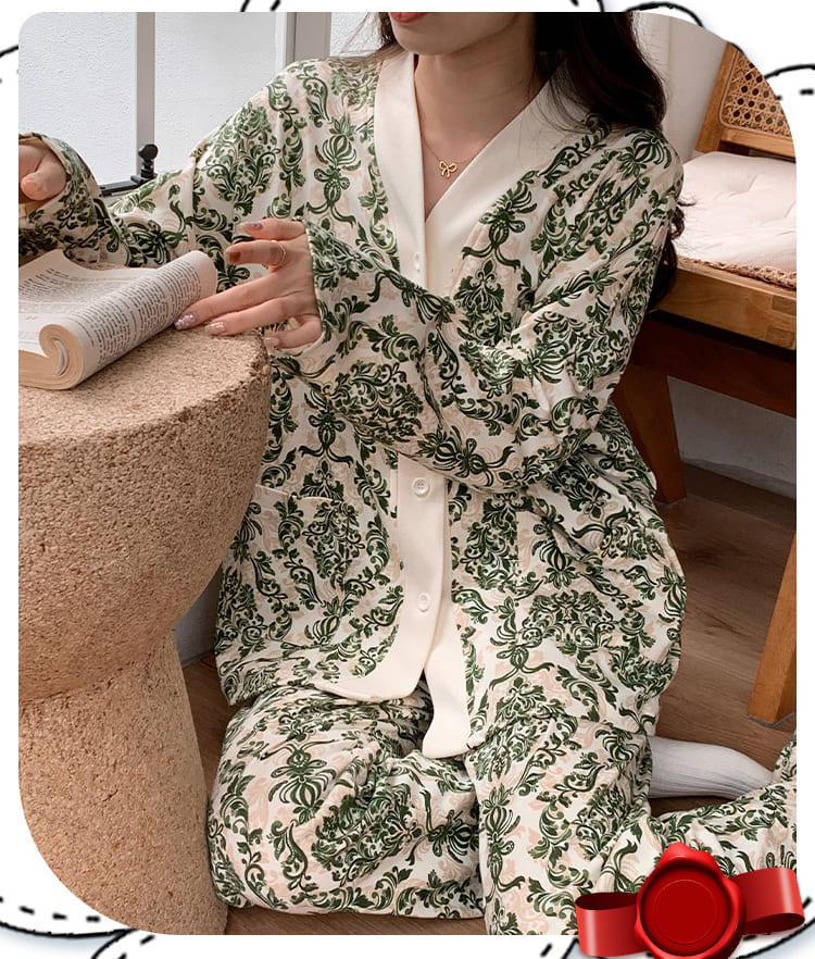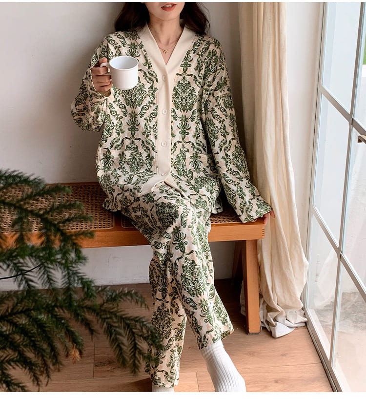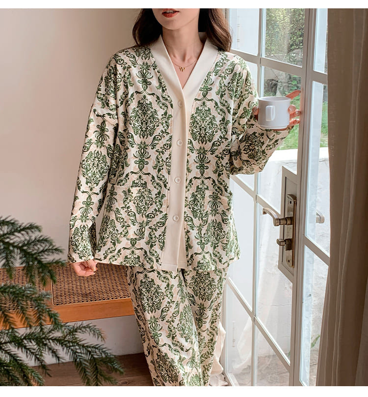 AKARA 好眠睡衣寬鬆穿慈禧綠長袖長褲連扣襯衫(秋冬 3XL有 寬版剪裁 中大尺碼)