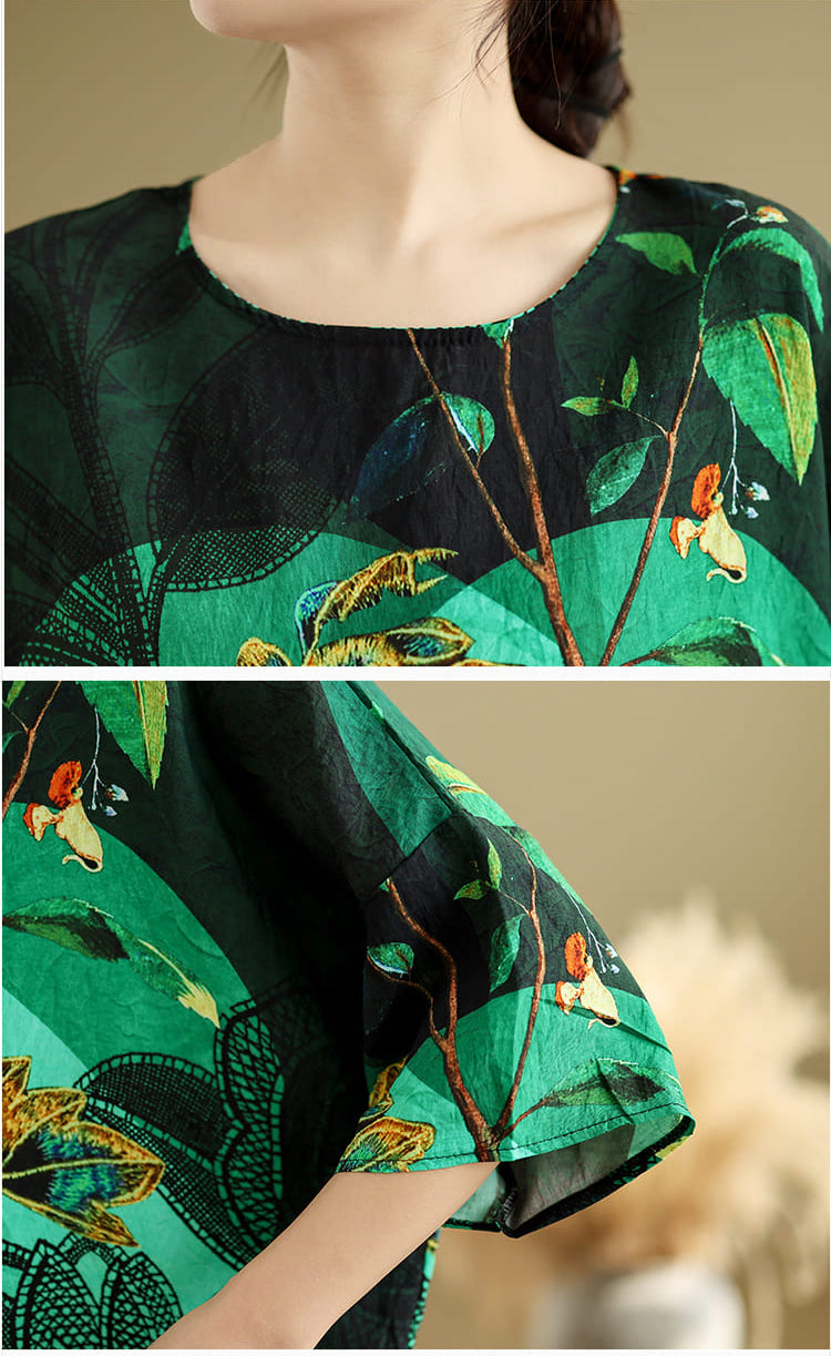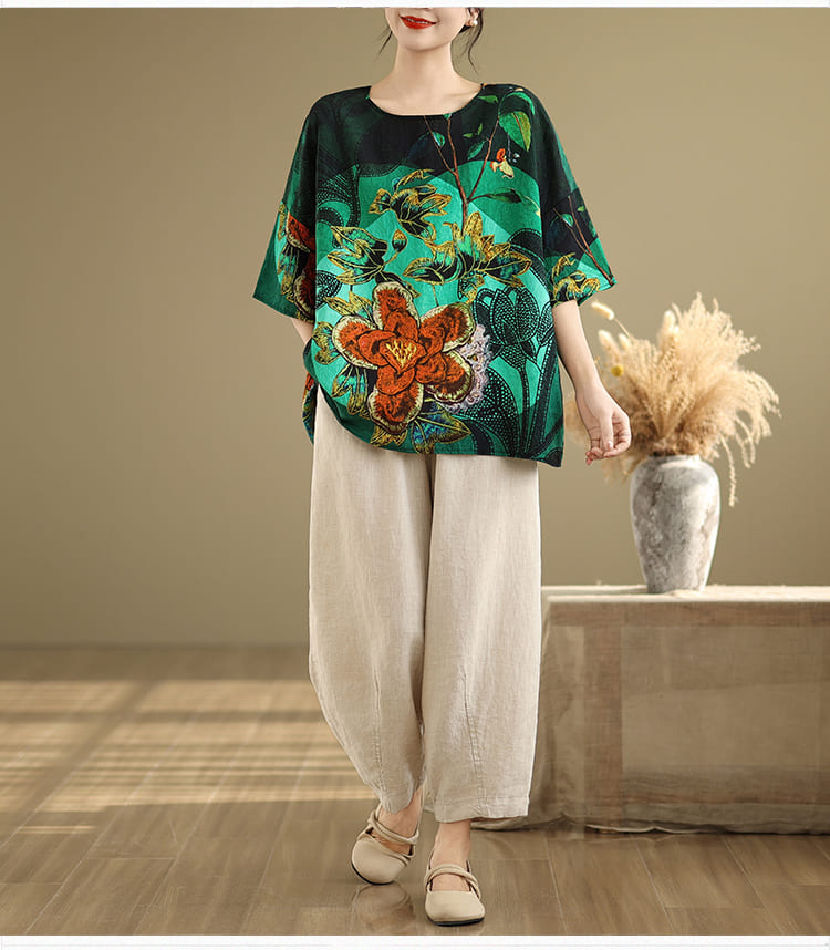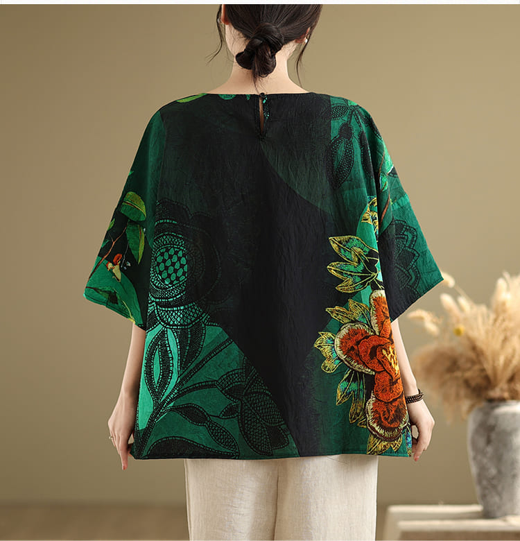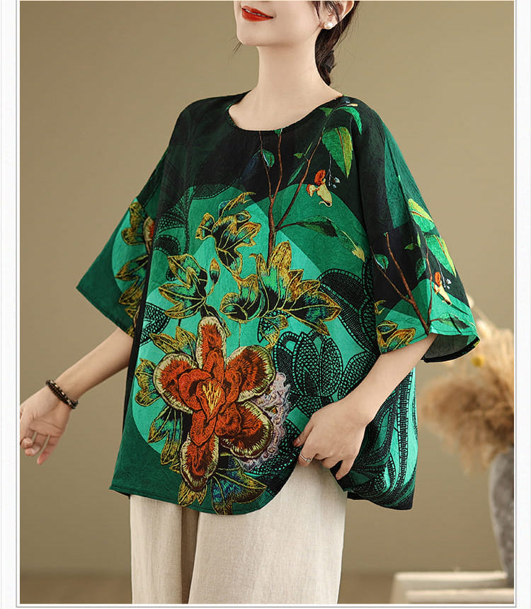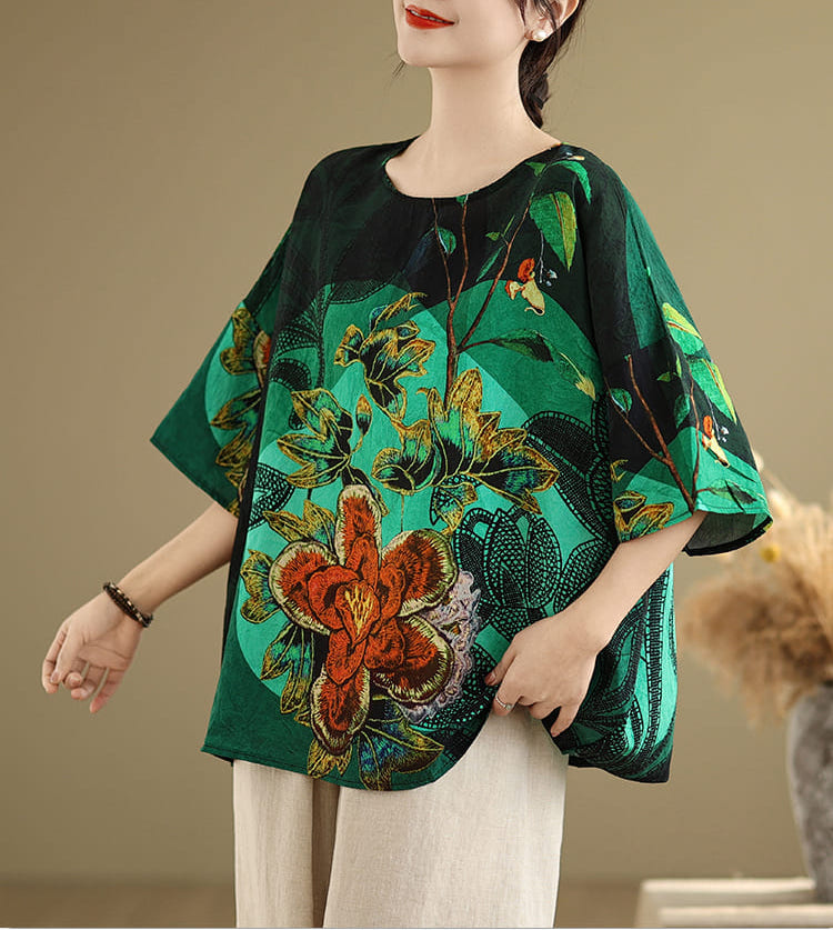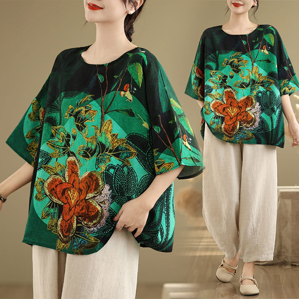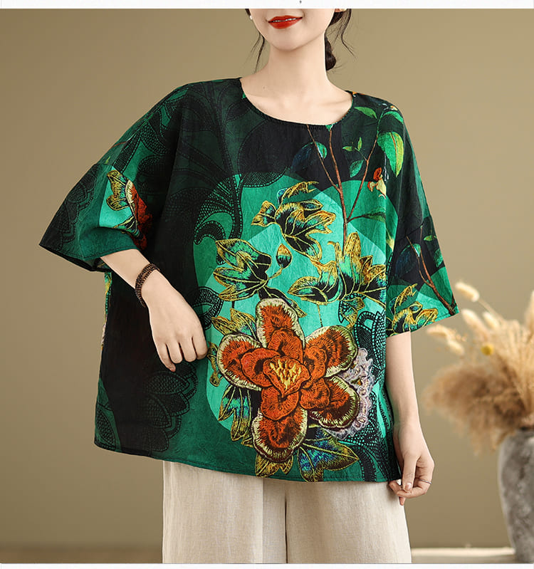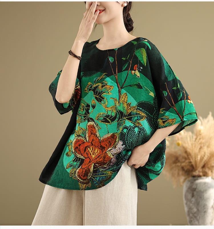 AKARA 綠翡翠華棉麻滿版多彩蝙蝠袖上衣(春夏 涼感 棉麻 寬版均碼 中大尺碼)