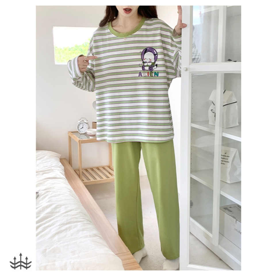 SCL 促銷 綠條紋 秋冬睡衣 長袖褲 中大尺碼 居家睡衣長袖褲套裝 81046