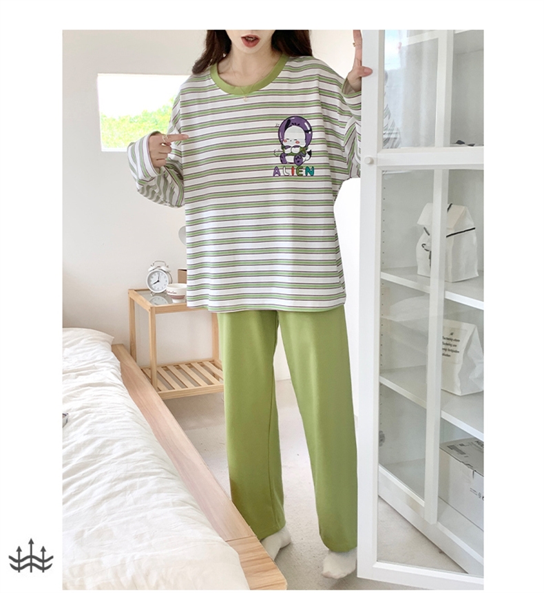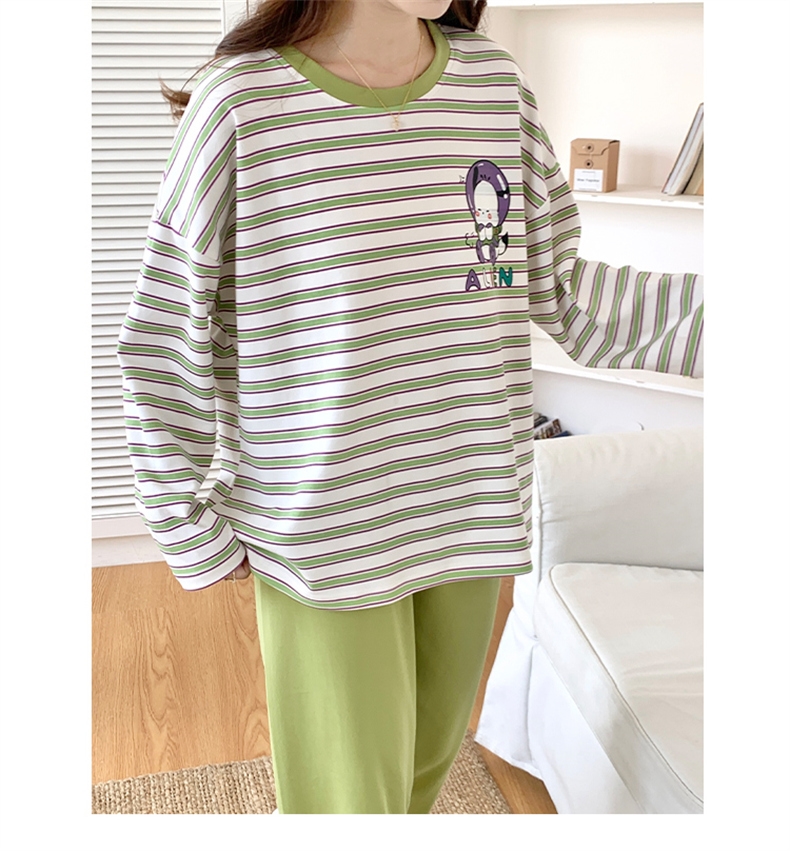 促銷 綠條紋 秋冬睡衣 長袖褲 中大尺碼 居家睡衣長袖褲套裝 81046