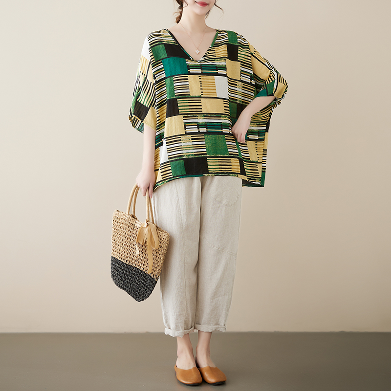 自然棉麻手感藤蔓五分袖上衣 3XL可(涼感 棉麻 中大尺碼)