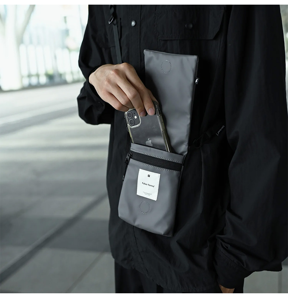 Fyber forma LAYR Mobile 側背手機包,專為放置手機及最少配置的外出小包款,採用前袋掀蓋設計,整體以 PU Fabric 防水面料製成,並在包體剪裁、面料應用及扣具上的搭配,呈現富含收納機能的休閒包款。