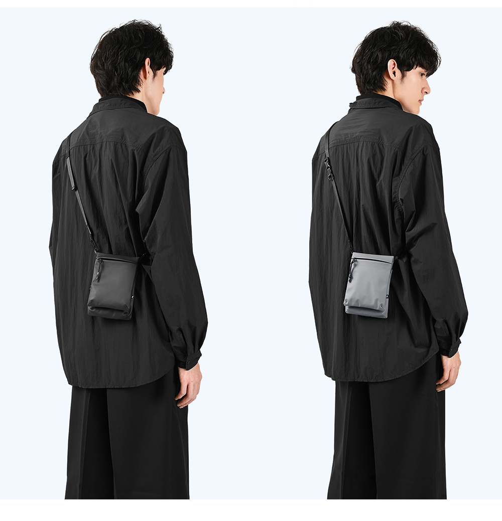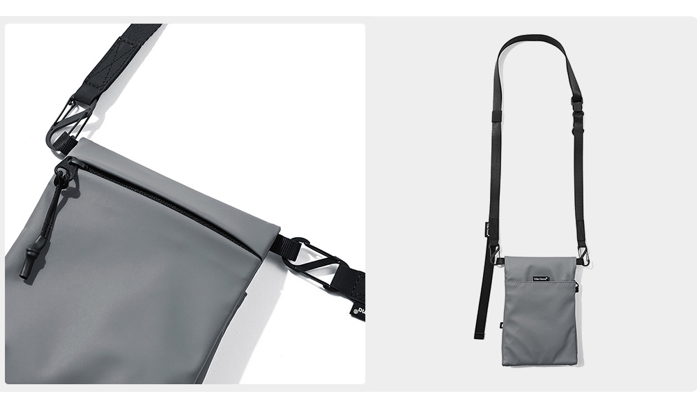掀蓋部分選用了隱藏式的磁吸設計,無需精準對位即可完成開閉合,並維持簡約的外觀設計。背帶部分採用 S 鉤扣可拆設計,搭配 15mm 織帶與韓國 WJ 可拆式調節插扣,可快速拆卸包包使用;並於背帶中段附加一組 D 型掛環,可自行擴充掛上零錢包、AirPods 等。