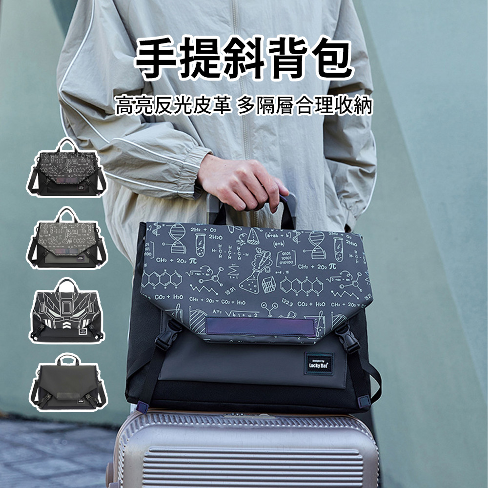 品 名:手提斜背包 材 質:滌綸 重 量:約610g 尺 寸:約40x10x30cm 規 格:全黑方程、黑灰方程、黑色、反光機甲黑 適用電腦尺寸:16吋內遊戲本