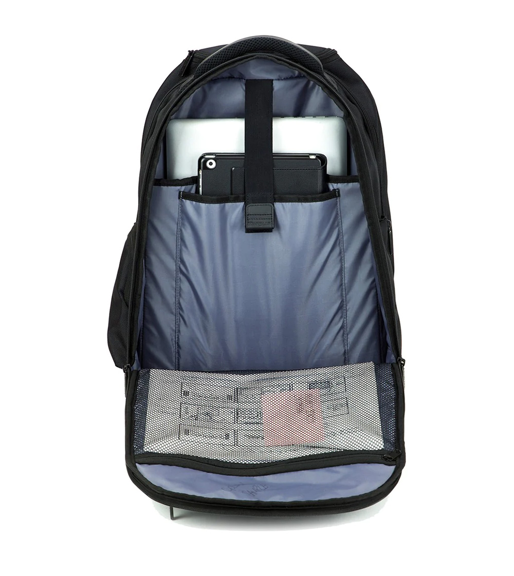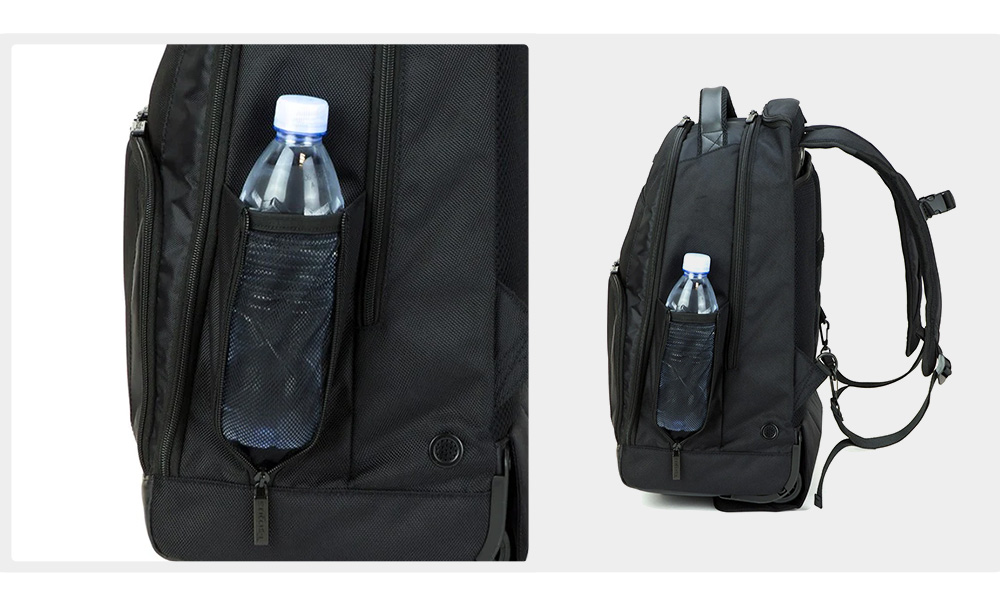 28L 容量設計,前方絨毛拉鍊口袋,可收納手機、墨鏡、藍牙耳機等;底部拉鍊口袋,交換用的名片、鑰匙、臨時票券,方便取用;前側主拉鍊層可收納筆記型電腦、平板、重要文件資料等,後側拉鍊層則可放入外出的短程衣物,底部做了魔鬼氈將兩層空間隔出,避免文件弄髒的可能,以及透氣孔設計,不必擔心通風問題。