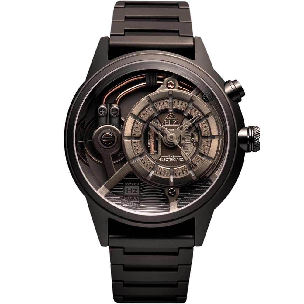 THE ELECTRICIANZ(暱稱ELZ)誕生於對傳統保守的奢侈品領域的強烈創新慾望。受當代視覺藝術和地下文化的強烈影響,ELECTRICIANZ的原創設計使手錶內部由電力驅動的機械裝置清晰可見。這是一個顛覆性的品牌。電氣是ELZ設計的核心。與許多鐘錶製造商不同,ELZ極具創意和創造性地秀出了電氣機械裝置,這樣極具工業風和現代感的設計,使ELZ成為鍾表界獨具一格的寶石。ELZ與眾不同的設計超越了電碼、元件和材料,以最簡單的方式模擬並表現出了“電”的概念與核心:電池、導體和顯示器。The ELECTEICIANZ // Brown Z - Metal