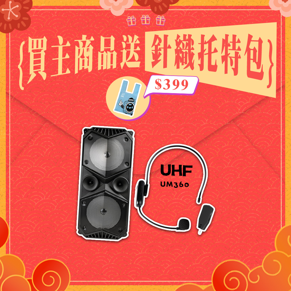 UM360:主體、3.5mm音源線、充電線、背帶、說明書、頭戴式無線麥克風