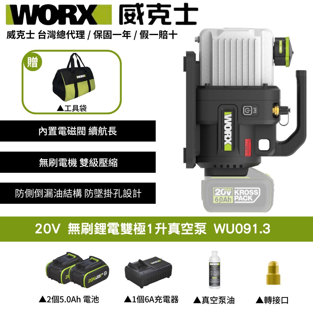 WORX威克士 20V 1L 2L 真空機 無刷 冷氣安裝 冷媒真空機 抽真空機 無刷真空泵 無刷锂电双极1升真空泵 WU091.3