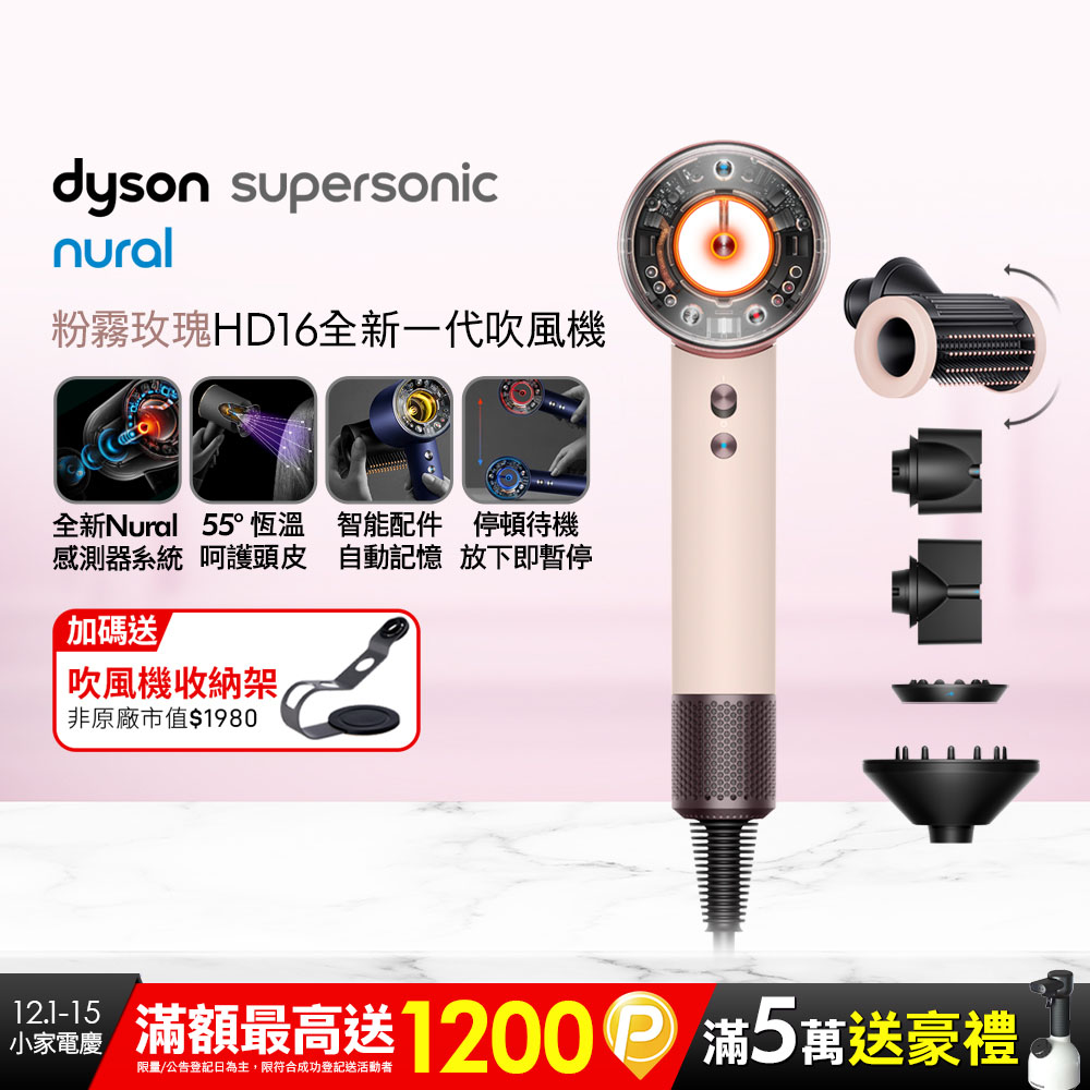 ➌ 停頓待機模式:動態加速感測器偵測你的動作,於放下吹風機時降低噪音以及減少風量Dyson Supersonic Nural™ 吹風機 HD16粉霧玫瑰