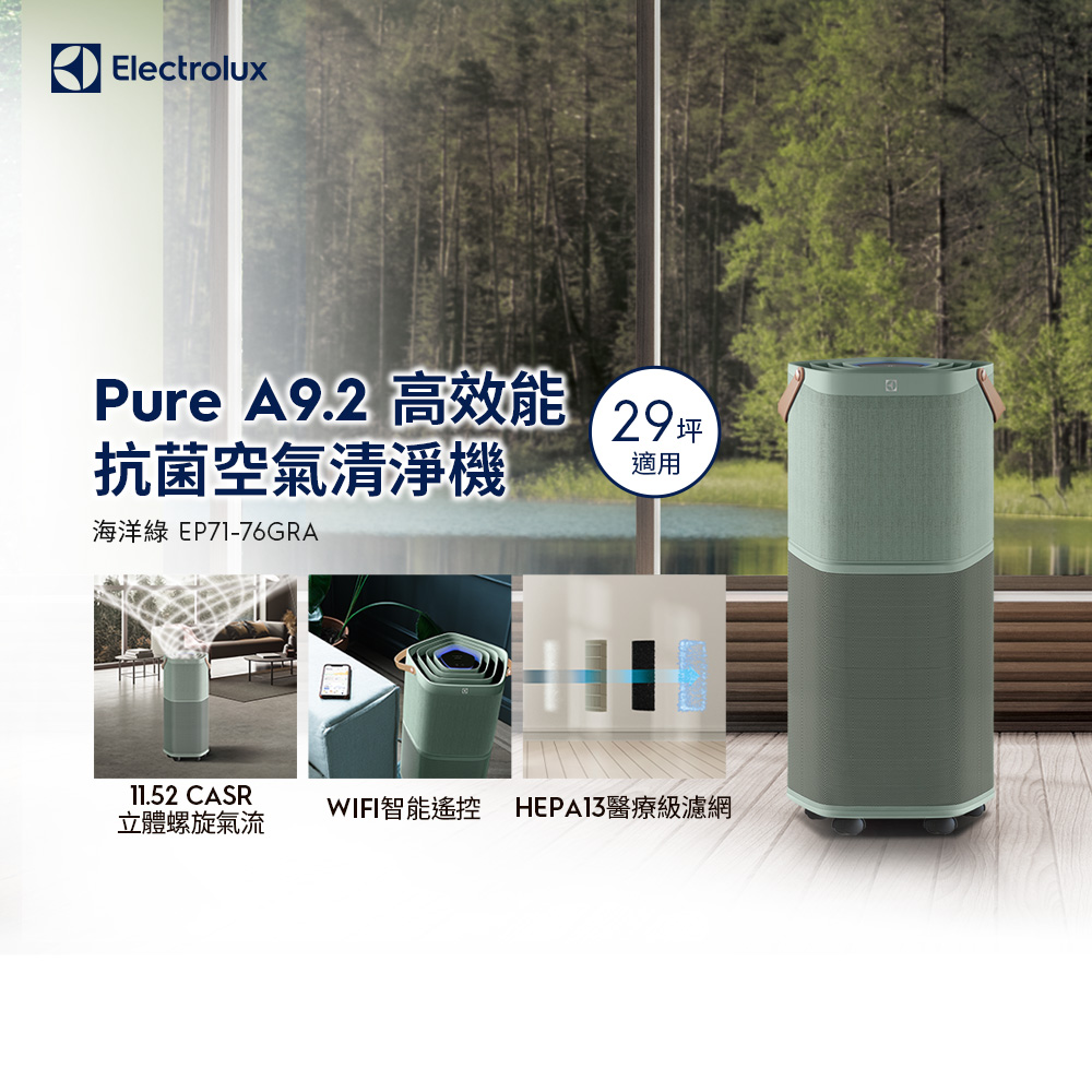 Electrolux 伊萊克斯 Pure A9.2 高效能抗菌空氣清淨機 (EP71-76GRA 海洋綠) 適用29坪空間