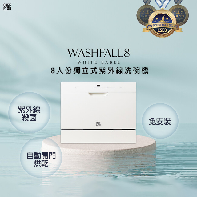 WASHFALL8是具備UV燈紫外線殺菌的8人份免安裝/獨立式/桌上型洗碗機,提供高規格自動開門與熱循環烘乾設計,