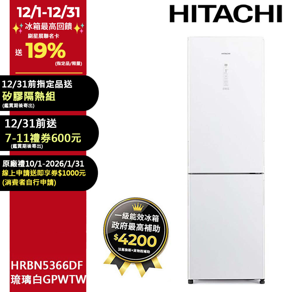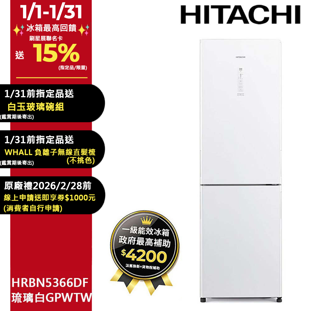 HITACHI日立313公升變頻兩門冰箱HRBN5366DF琉璃白(GPWTW)