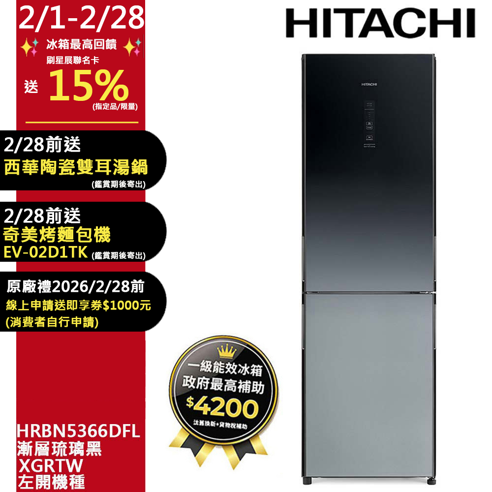 HITACHI日立313公升變頻兩門冰箱HRBN5366DFL左開漸層琉璃黑(XGRTW)