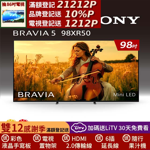 ![SNY迎新好活動期間 20212/162026/3/1買活動期間購買指定商品加購優惠價等超值優惠活動請於2026/3/前登入會員並完成商品註冊請掃描左方 QR Code 至活動官網 幫你升级 Mini LED 機種 BRAVIA 5系列滿足不同空間場域需求□ 超大視界認知智慧處理器 XR 降噪銳化超越AI結合專業背光制核心技術,精準控制 LED,展現令人讚嘆鮮明對比。加入全新人工智慧演算,降低雜訊,精緻畫面,再現專業電影工作室品質。放大視野,如臨現場,沉浸觀影新境界。控光 4倍 耗能 3%Y-85XR90Y-98XR50BRAVIA Theatre Bar 8HT-A8000 家庭劇院乙[原價 29,900] 頂級經典Y-75XR90Y-65XR90Y-77XR80 高階精選Y-65XR80Y-75XR50BRAVIA 旗艦娛樂組合買(註冊送Y-85XR70Y-85XR50Xperia 10 智慧型手機(顏色隨機出貨)[原價 $14,990]以上榮獲經濟部節能 BRAVIA 節能機種精選區超值加碼 行家推薦人氣熱賣O BRAVIA 指定機種Y-55XR80Y-65XR50Y-65S31TY-75530Y-55XR50Y- BRAVIA Cam$$2,000好禮享券2.0好禮即享券2.0*好禮即享券2.0*$5.000$3.000$2.000王品註冊送好禮即享券2.0*$1,000BRAVIACAM*好即享券 2.0 為,使用方法詳見活動網站。 *BRAVIA Cam 將透過更新支援功能;適用型號BRAVIA 9/BRAVIA 8/BRAVIA 7/BRAVIA 5* *以上顯示器皆榮獲經濟部節能標章認證。 好禮即享券2.020項品牌隨選輕鬆換- foodpanda台: PARK GRAND HYA SHERATON飯店觀光事業秦安|| 乾杯集團 TTKANPAI GROUP爭鮮 爭鮮定食8瓦城集團 DECATHLONPOYA*好禮即享券 2.0 為電子,票券後一年並使用完畢,惟 foodpanda 一年內並於六個月內使用完畢,逾期無效(以收到Email / 的起算)。*因電子為不記名,任何人兌換,請自行保管,如盜用,恕不補發。台灣索尼股份有限公司Sony Taiwan Limited 客服諮詢/訂購專線 4499111*活動辦法請以活動網站公佈為準 *台灣索尼股份有限公司保有最終取消、終止、修改或暫停活動的權利,恕不另行通知 *以上贈品款式及顏色均以實物為準,數量有限,送完為止](https://img.pchome.com.tw/cs/items/DPAD06A900J01OO/i010001_1765857563.jpg)