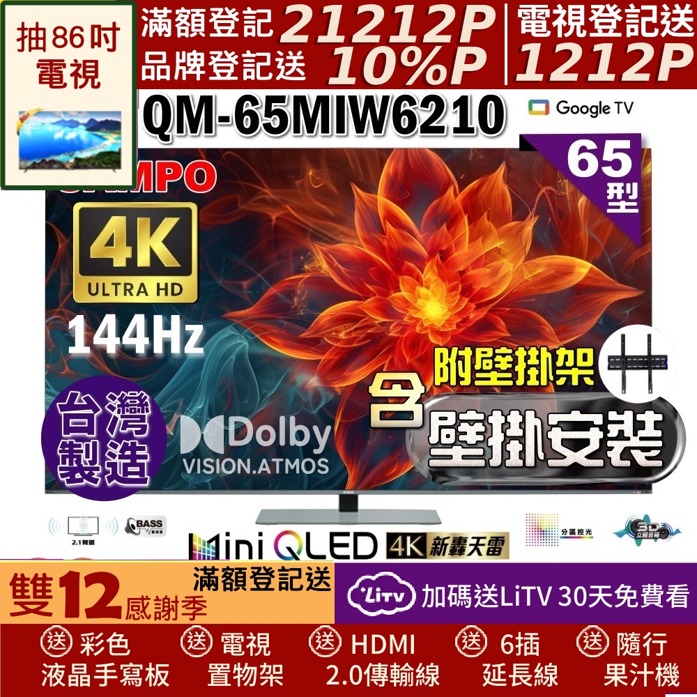 SAMPO聲寶 65型4K 144Hz 新轟天雷智慧聯網MINI QLED顯示器(QM-65MIW6210福利品+壁掛安裝+好禮2選1)
