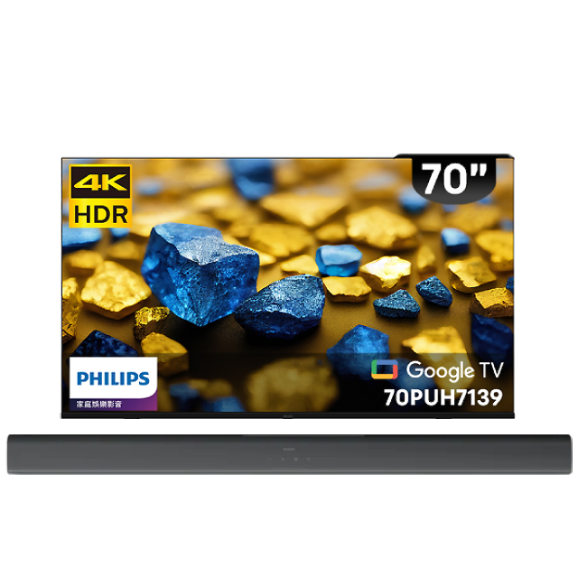 PHILIPS 飛利浦 70型 4K Google TV 杜比智慧顯示器 含飛利浦2.0聲道藍牙聲霸+超薄壁掛架+電視情境燈 (70PUH7139)