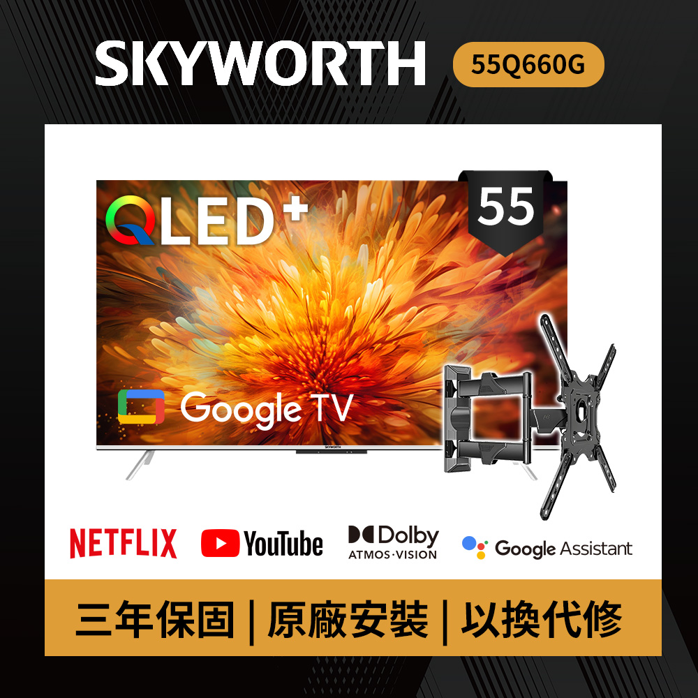 SKYWORTH創維 55吋 4K QLED 萊茵護眼認證 Google TV聯網顯示器 (55Q660G+手臂式壁掛)