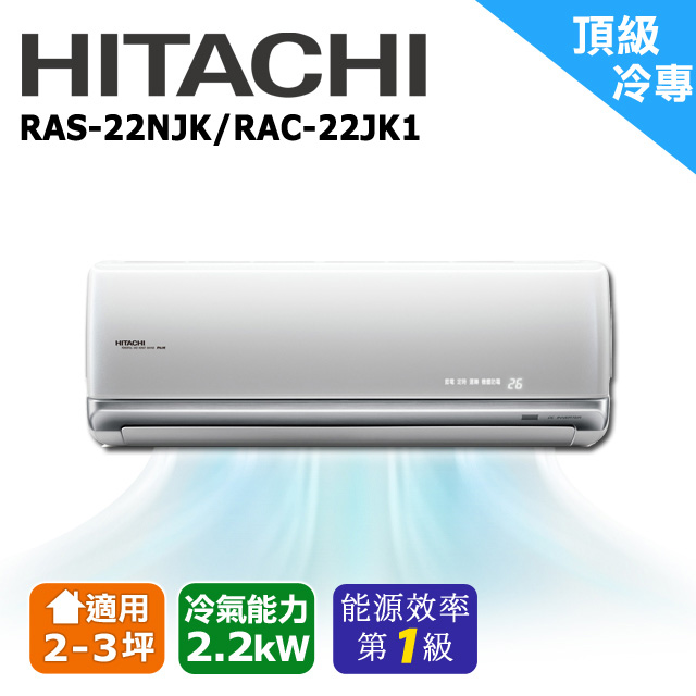 ![凍結0日立冷氣最新凍結3.0/室外均搭載油污去凍結洗淨透過將熱交換器加熱軟化附著油污,有效加強續行程的洗淨力,讓達到全方位的潔淨頂級冷暖適用凍結洗淨3.0及油污去除能,頂級冷專型適用凍結洗淨僅乾燥)。凍結洗淨 3.0機室外機為技術表現示意,非實際運轉畫面加熱 凍結3洗淨4熱風凍結洗淨 3.0運轉行程加熱凍結洗淨將熱交換器加熱融化軟化附著的油污急速冷卻熱交換器至零下利用解凍水流带走污垢熱風熱風運轉加速乾燥加熱凍結3洗淨凍結洗淨 3.0運轉行程逆轉除塵加熱凍結洗淨 & 乾燥逆轉風扇吹走熱交換器上的灰塵將熱交換器加熱融化軟化附著的油污急速冷卻熱交換器至零下利用解凍水流帶走污垢並送風乾燥*此為室機與室外機行程示意,實際行程序為室內機熱風乾燥與室外機凍結同進行,室內機離抑菌於室外機凍結洗淨完成後進行。此為技術表現示意,非實際運轉畫面日本同步科技日本製日本制御技術]全直流變頻]日本制御技術,動力更強最大電氣效率達99小型也能發揮大能力般變頻空調機日立變頻冷氣採用日本制御技術,以超高頻度的輸出,精準地控制脈幅調變系統,避免能源的損失,在負載大,能加大至30V如同汽車加大油門)以提高迴轉速,同時電源可提昇至99%,速冷速暖更省電。率因數電壓時功日立變頻空調機電壓功率因数0V 壓縮機20V壓縮機一般變頻空調機不足馬力提升有限日立變頻空調機功提升260V壓縮機360V260V壓縮機 電壓作功系統節能優化全新結構設計,貫流風扇直徑放大1%內機框體流路增加39%熱交換器面積加大以及新片型設計降低阻抗,提升整體送風效率及節能效果,長送風距離並且安靜無聲。蒸發器面積提升阻抗降低內機框體流路面積增加貫流風扇直徑提升蒸發器面積數值為頂級系列NJP與NJK2.8kW機比較之結果,其餘標示數值為旗艦系列HQP與HQK精品系列YSP與SK2.8kW機種所之比較結果ONLIN高性能PU 省電第一同步日本最新變頻控制技術,讓變頻控制更穩定,壓縮機壽命更長。採用高性能CPU運算速度提高60%,加上日立PAM全直流變頻控制,將最小電力發揮最大能力,超越20年國家一級能效標準201%,業界省電第一。*指日立冷氣RAC-22N3之CSPF.50,與2025年國家一級能源效率標準比较。面板自動開啟進氣面積大幅增加貫流風扇直徑、長度擴增四折式熱交換器高效率風道提升CSPF201%12108日立變頻冷氣2025國家12.50一級標準6.23省電全面大提升室內機面板自動開啟裝置,大幅增加進氣面積,並搭載四折式熱交換器,加上貫流風扇直徑、長度擴增,配合全新風道設計,CSPF能源效率1級,節能省電全面大提升 購創新節電科技運轉/停止節電依據運轉時的室外度,可自動設定既舒適又省電的溫度範圍:冷氣、26~28℃;暖氣18~20℃,一按節電鍵,面板即投射顯示之,一目瞭然,滿足現代享受便捷、同時節能的智慧生活。舒 快速 節電 取消保濕 高開自動保濕12 30 E記憶高效率送風系統室外機採高效率螺旋風扇與低風阻吹出設計,除可降低送風噪音外,更可降低馬達消費電力,節能又省電!低風阻吹出採用千鳥型吹出,風性佳,且通風阻抗小。高效率螺旋風扇千烏型吹出柵高效率、低噪音螺旋風扇降低風噪音,降低馬達消費電力。PM0.1去除率99.9%全面升級,採用高分子觸媒濾網、高密度銀離子濾網,更搭載PM0.1清淨濾網,呼吸更健康。*依據TTRI檢驗報告,針對細懸浮粒PM0.1以流量32LPM通過100cm²濾網之捕集率99.99%home 購物高分子觸媒濾網PM0.1濾網右側全面護塗裝左側防護塗裝銅管防腐蝕科技短加厚15%無防護塗裝高密度銀離子平濾網室內機熱交換器兩側以環保防微高分子塗料科技烘烤工法塗裝,避免銅管被沼氣、濕氣侵蝕及滋生黴菌,塗料通過SGS試驗:黴菌生長零檢出,防黴效果接近100%,安心更耐用。銅管防防腐蝕科技影片體感舒適科技溫度、濕度雙重控制科技,讓設定溫度由室內溫度升級為體感溫度,在相同設定溫度下,節能又涼爽得到更舒適的體感。圖示數值為參考值,並非絕對值,實際濕度依環境不同會有所差異。體感舒適科技影片 購物26°C60%溫度濕度(+Ag.Ag+Ag+露水盤銀離子抑菌露水盤內建銀離子裝置,藉由銀離子破壞細菌DNA使其無法繁殖,經由QTEC測試(報告編23KB00177-1~4)後,抑菌效果99.99%。可避免露水盤滋生黴菌、減少小孩過敏等呼吸道症狀。365智能防霉待機防霉監控NLINE時智慧監控室內機內部溫、濕度,並於溫度、濕度達到黴菌滋生標準時購物主動提醒,送出熱風抑制菌類生長,同時可搭配APP功能,隨時把關機體狀態。待機時開機時關機後智慧監控機部溫/濕度超標時主動提示 降低機體內溫度減少異味 吹乾機體內殘留水分智慧機體防霉空調關機前,進行送風,乾燥熱交換器。除了原有5段(10、20、30、45、60分鐘)時間可選擇外,全新新增自動段H選項,依使用習慣,智慧判斷送風防霉時間,使機體內保持乾燥。3D立體氣流一般冷氣只有上下自動擺動的導風板,冷氣吹送的範圍受限;日立冷氣不僅將上下導風板加長,並新增左右方向可自動擺動的導風板,使冷氣吹出角度更大、傳送更遠,創造出3D立體舒適氣流,均勻分佈整個室內。型可透過App遠端操控主動執行機體防霉功能吹送清新空氣抑菌、防霉 完成防霉風扇 抗污抑菌壁掛型貫流風扇新增防霉效果,可有效抑制長期於高濕環境下黴菌的生長,同時減少風扇髒污,使吹出的空氣更乾淨。防霉風扇影片新舒眠恆溫 快適採用日立變頻控制技術,能精確微調機體吹出