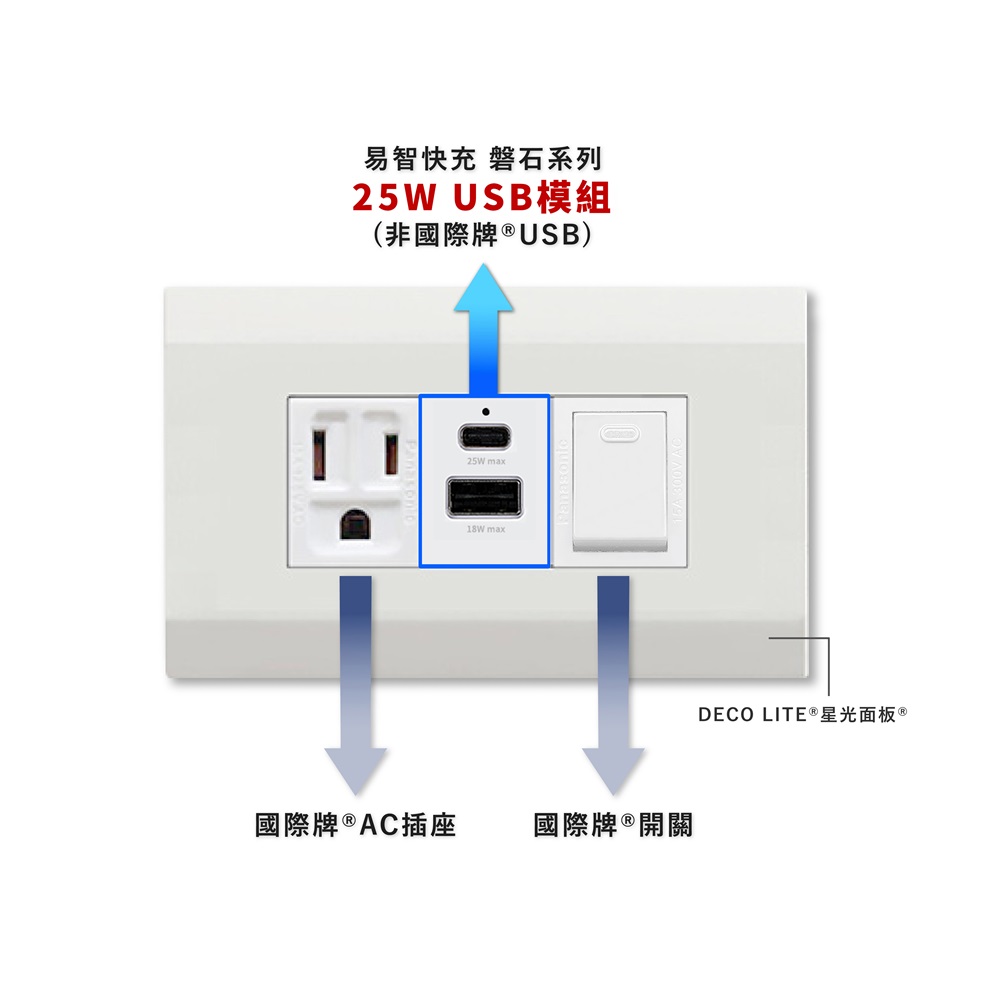 - 易智快充 磐石系列25W大功率快充;適配3公分預埋盒