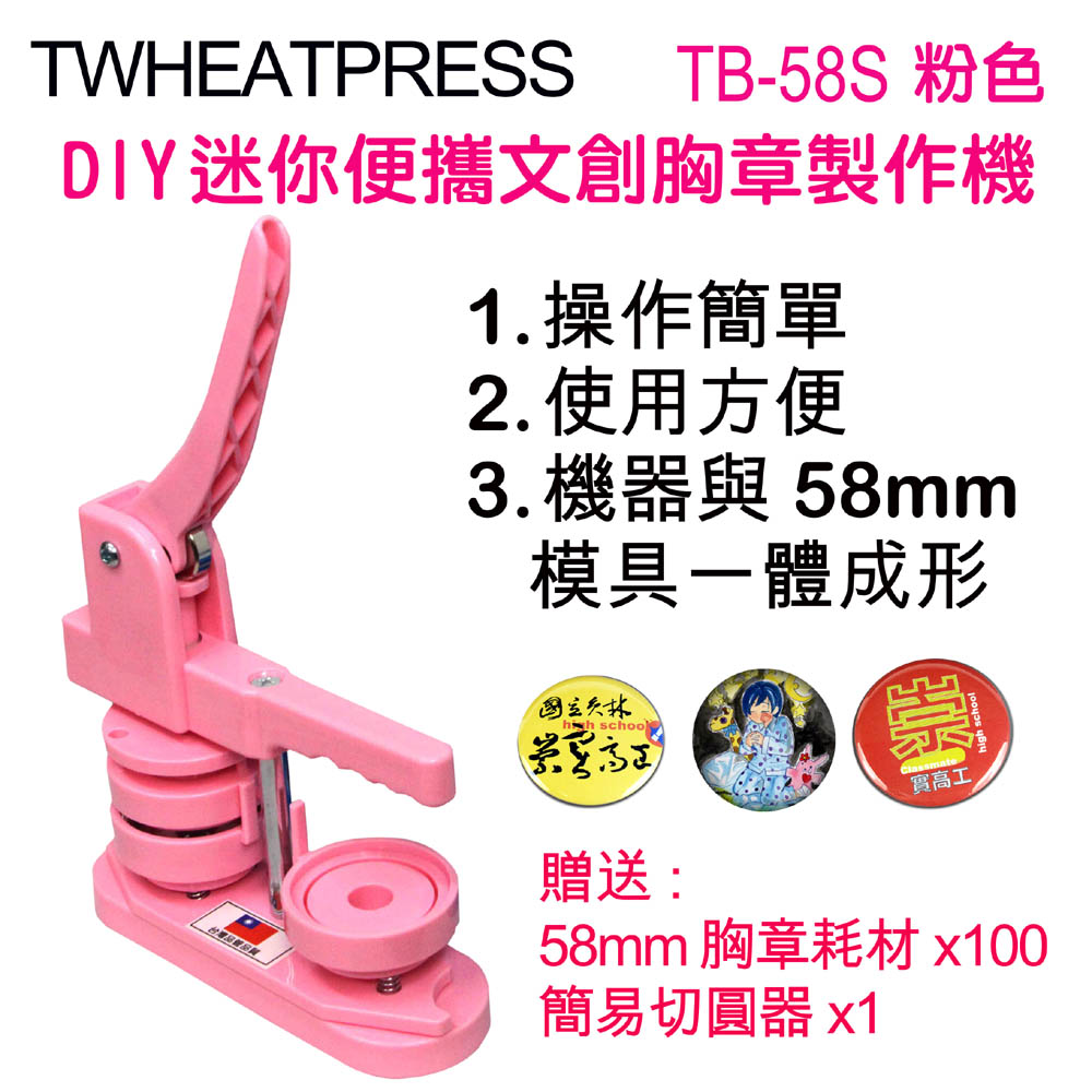 TWHEATPRESS迷你便攜DIY文創徽章機胸章機TB58S粉色送100組耗材學校活動美術手繪禮品夏令營家庭日園遊會