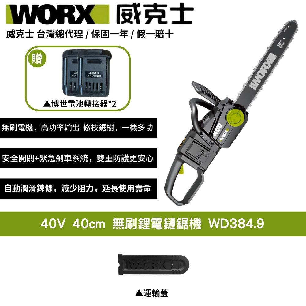 WORX威克士 40V 40cm 鏈鋸 電鋸 鏈鋸機 無刷 鋰電 園藝 切樹 電動鋸子 無刷電機 鋰電手持鏈鋸 WD384.9+F48