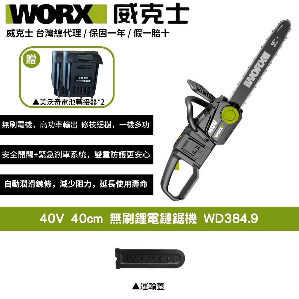 WORX威克士 40V 40cm 鏈鋸 電鋸 鏈鋸機 無刷 鋰電 園藝 切樹 電動鋸子 無刷電機 鋰電手持鏈鋸 WD384.9+F49