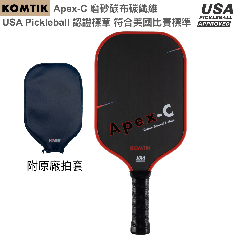 KOMTIK Apex-C 碳纖維匹克球拍 16mm拍芯 磨砂碳布碳纖維 USA Pickleball 認證標章 紅色框 附拍套