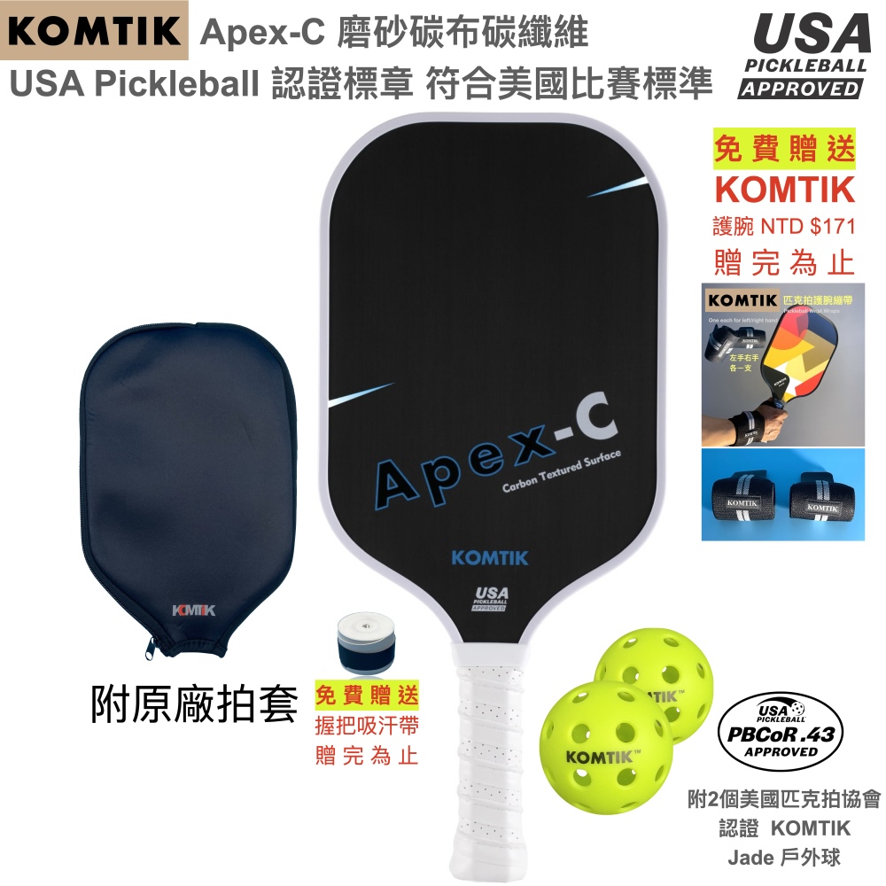 KOMTIK Apex-C 碳纖維匹克球拍 16mm拍芯 磨砂碳布碳纖維 USA Pickleball 認證標章 白色框 附拍套 附戶外球