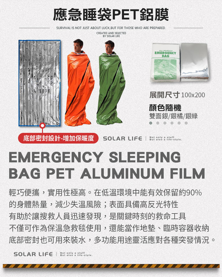 應急睡袋:在低溫環境中能有效保留約90%的身體熱量,減少失溫風險,表面具備高反光特性,有助於讓搜救人員迅速發現,是關鍵時刻的救命工具,不僅可作為保溫急救毯使用,還能當作地墊、底部密封也可用來裝。