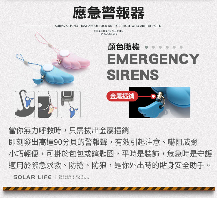 應急警報器:只需拔出金屬插銷,即刻發出高達90分貝的警報聲,有效引起注意,小巧輕便,適用於緊急求救、防搶、防狼,是你外出時的貼身安全助手。