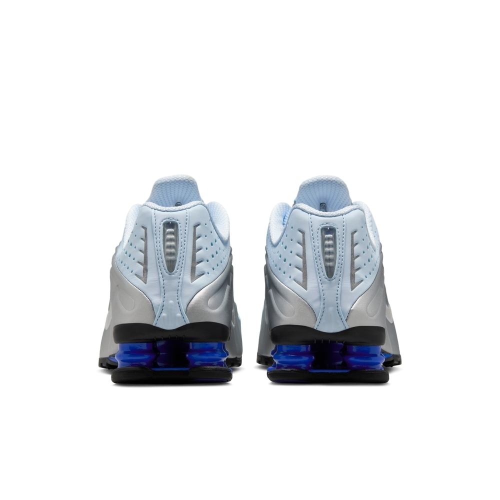 - Nike Shox R4 以合成和布質鞋面、優美的線條設計與雷射沖孔工法,重現原版鞋款,再現 2001 年經典鞋款風貌。 Nike Shox 緩震技術可分散受力,發揮舒適非凡感,並呈現高機能鞋款造型。優點Nike Shox 支撐柱可提供靈敏的緩震機能,最初是為跑者提供充分支撐而設計。鞋面幾乎完全復刻 2001 年推出的 Nike Shox 原版設計。改良式圓形鬆餅格紋外底,提升抓地力。整體雷射沖孔設計,加強透氣。產品詳細資料不適合作為個人防護裝備 (PPE)