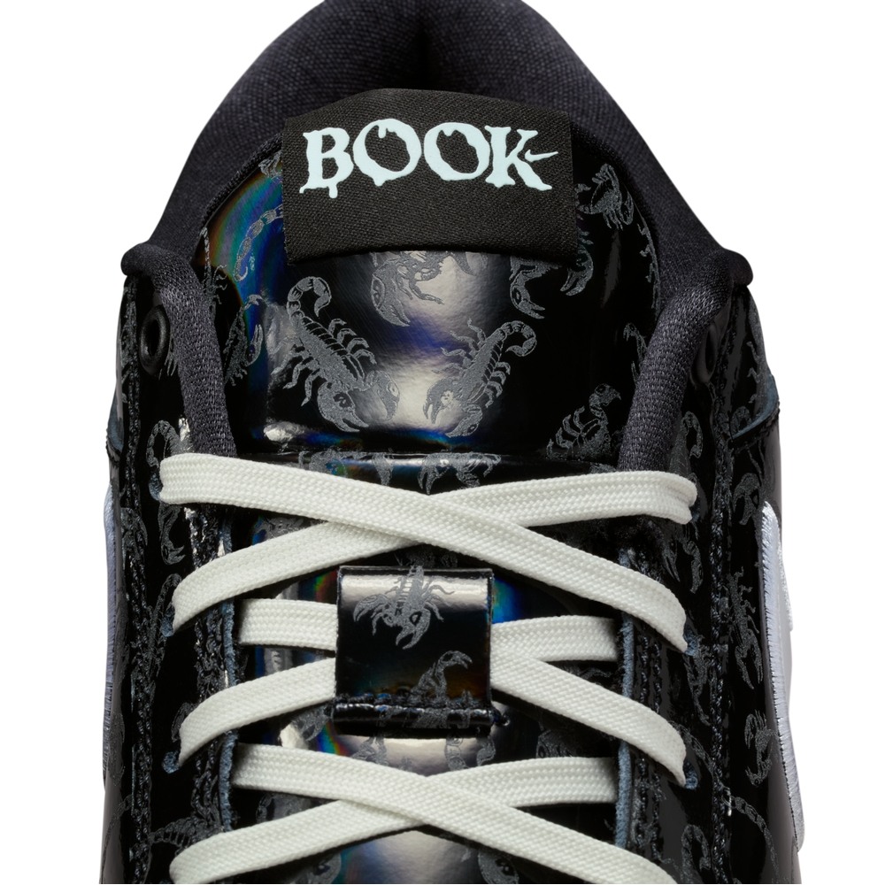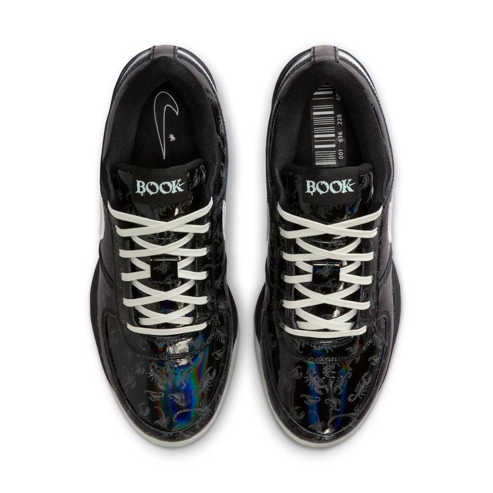 - 這款 Book 1 "Scorpion" EP 男子籃球鞋結合蛛形綱動物的特性, 鞋面採用黑色配色搭配炫彩細節並印有蝎子圖案,塑就醒目風範。 結合夜光外底,讓你犀利切入、迅速席捲全場。 耐穿橡膠外底為你帶來強勁的抓地效能。停頓加速,控制自如鞋跟搭載 Air Zoom 氣墊,提供靈活的反應速度,無論是在開放空間迅猛起跳,還是應變急煞,皆可輕鬆駕馭,助你在籃框附近跳步急停,配以投籃假動作,彰顯 Book 的風範。穩定腳步,靈活轉身中足配置堅固塑膠穩定片,在迅速移位時穩定腳步,輕鬆應對急停轉向、具 Book 特色的轉身動作、籃下敏捷突破,以及利用空間迅速切入。強勢切入,過人表現人字形抓地鞋紋提供非凡的抓地力,有利側向切入和快速變換移位。全鞋長泡綿柔軟回彈的全鞋長泡綿,助你舒適馳騁,靈活切入。敬請注意,因拍攝緣故圖片中展現的鞋盒除去了產品標籤。