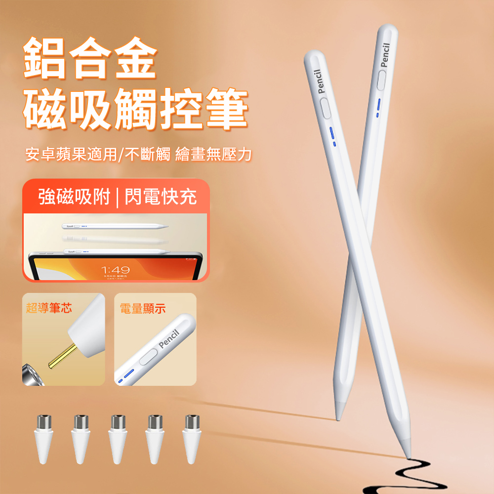 適用機型:適配市面上95%的電容屏設備 產品功能: Type-C介面快充 即時電量顯示/無延遲/適用蘋果安卓通用 產品材質: 筆身材質:鋁合金(表面鋼琴烤漆)帶磁吸 筆尖材質:蘋果POM材質筆頭 產品淨重約 :68g 產品重量(帶包裝盒及配件):73g 產品大小:16.6*0.89*0.89cm 包裝尺寸:21*6*2.5cm