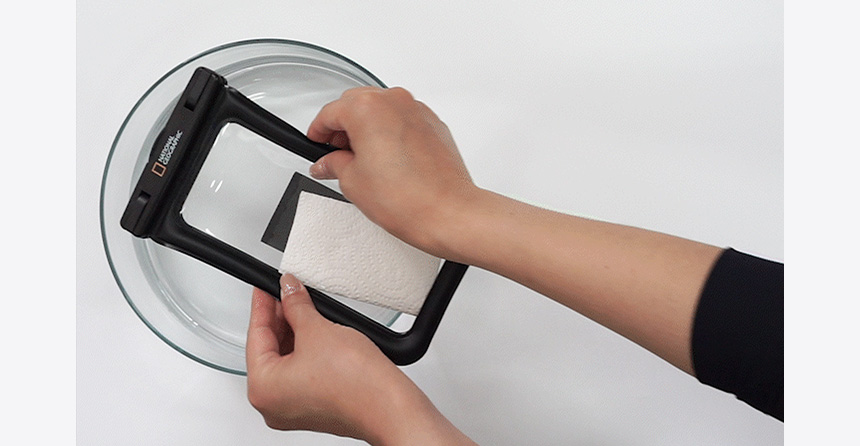 因此防水袋的透明面上會有霧霧的水痕,使用酒精擦掉即可 !