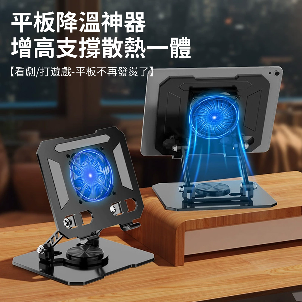 Ouboo 可旋轉折疊帶風扇一體平板支架 360°可調節旋轉金屬支架 平板支架 學習辦公必備桌面支架