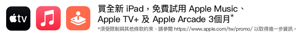 買全新 iPad 免費試用 Apple Music、Apple TV+ 及 Apple Arcade 3個月。須受限制與其他條款約束,請參閱 http://www.apple.com/tw/promo/ 以取得進一步資訊。