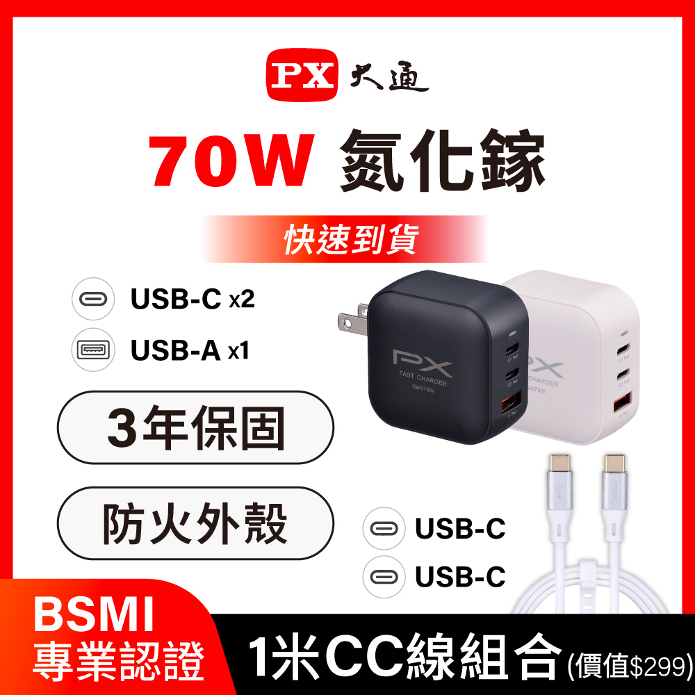 PX 大通 送CC充電線1米 70W瓦 充電頭 氮化鎵 充電器 快充頭 蘋果 三星 iphone 手機 平板 筆電(PWC-7012W/B)