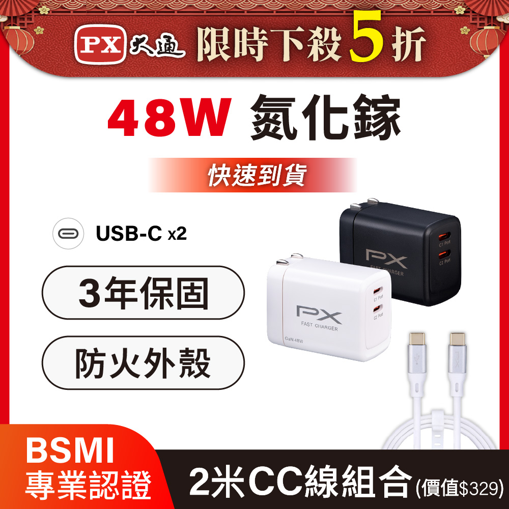 PX大通PWC-4802W 氮化鎵GaN 快速充電器48W 雙孔Type-C 手機快充頭白