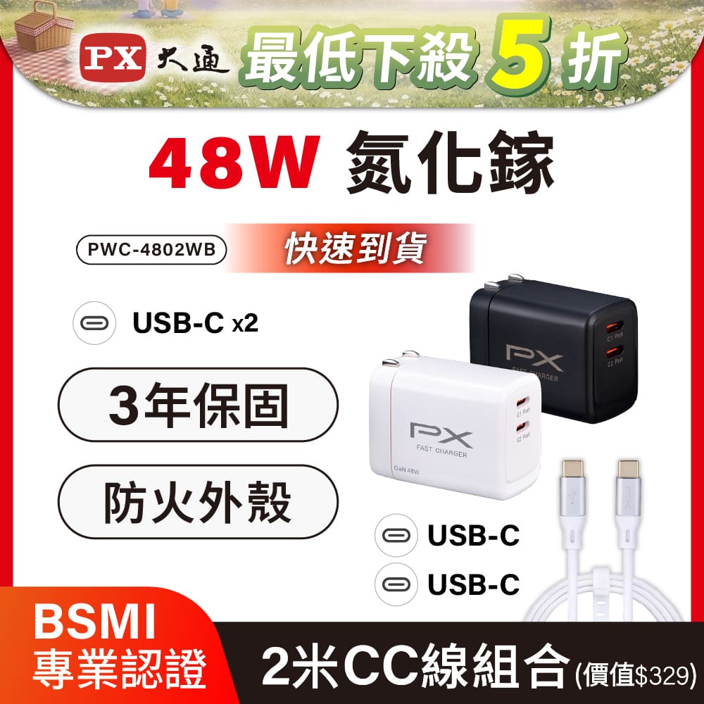 PX 大通 送Type c充電線2米 48W瓦 充電頭 氮化鎵 充電器 快充頭 蘋果 三星 iphone 手機 平板 筆電(PWC-4802W/B)